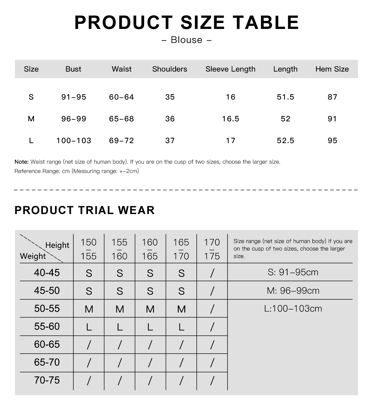 Karena semua pengukuran dilakukan secara manual dengan pakaian yang dibentangkan, mungkin ada sedikit kesalahan antara tabel ukuran dan pengukuran pakaian yang sebenarnya. Rentang Referensi: cm (Rentang pengukuran: +-2 cm)