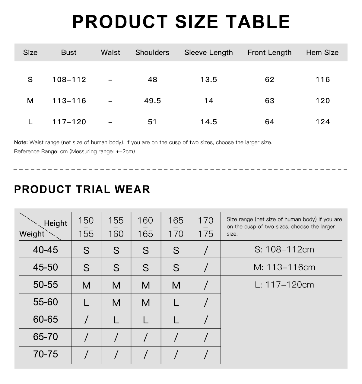 Karena semua pengukuran dilakukan secara manual dengan pakaian yang dibentangkan, mungkin ada sedikit kesalahan antara tabel ukuran dan pengukuran pakaian yang sebenarnya. Rentang Referensi: cm (Rentang pengukuran: +-2 cm)